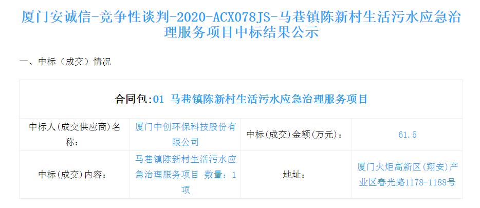 中创环保中标厦门市马巷镇陈新村生活污水应急治理服务项